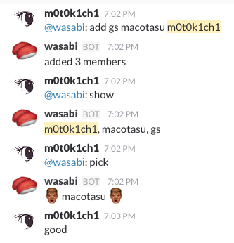 自分のプロジェクトのエンジニア間では、「誰がやるか決めようぜ!!!」みたいなことがときたま発生するので、以下のような感じのことができる Slack bot をつくった。