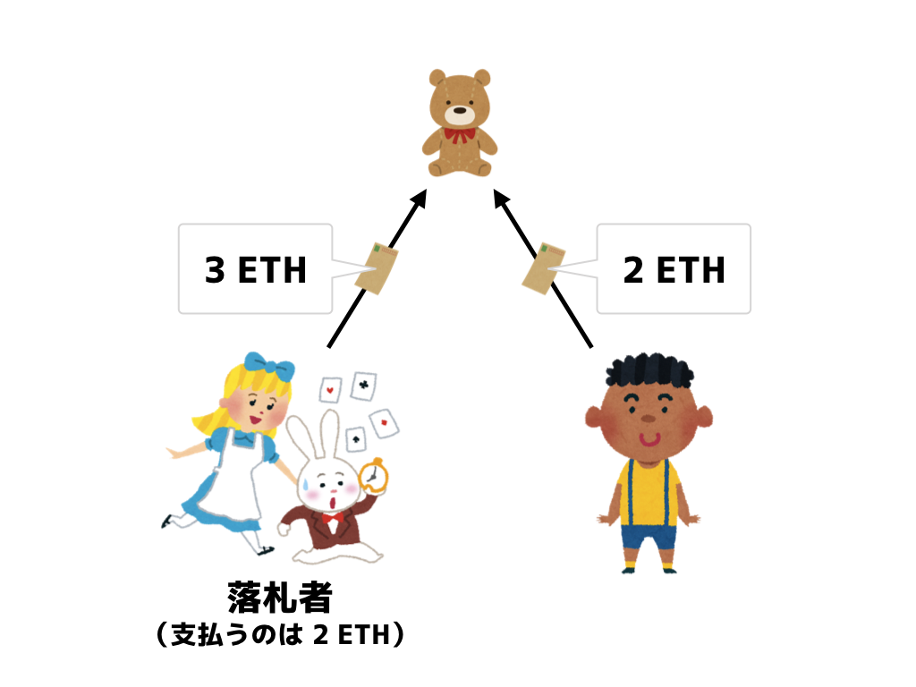 この表を見ながら、「あのクマさんになら 3 ETH 支払ってもいいワ」と考えているアリスが、いくらで入札すべきなのか考えてみます。ここで注意すべきは、ボブがいくらで入札してくるのかはまったく分からないということです。
