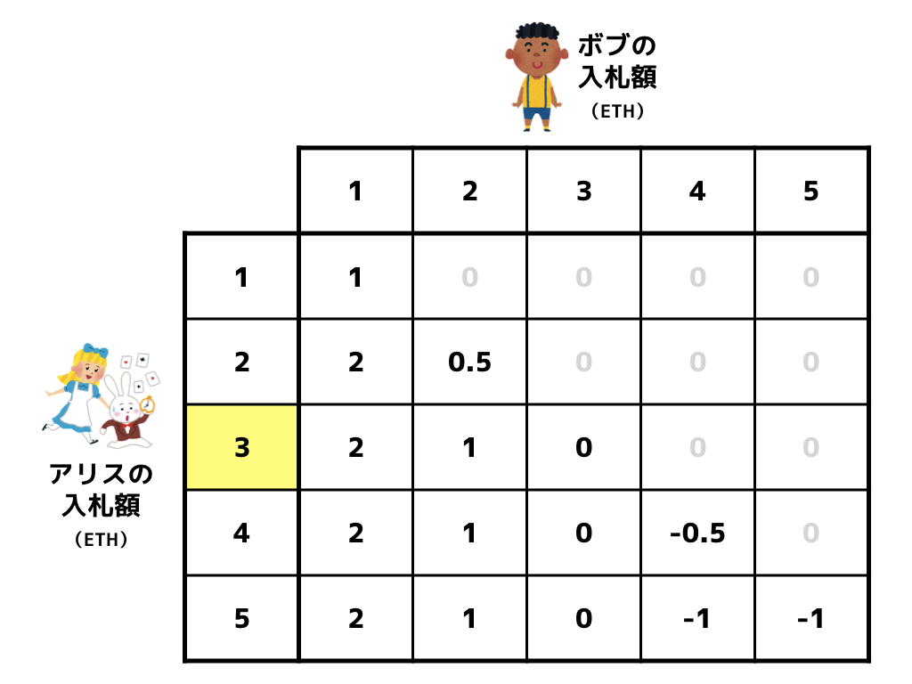 ということになります。もちろん、評価額が 3 ETH でないときも、評価額を正直に入札するのが最も合理的となります。また、アリスもボブも状況は同じなので、ボブの立場に立って考えてみても同じことです。