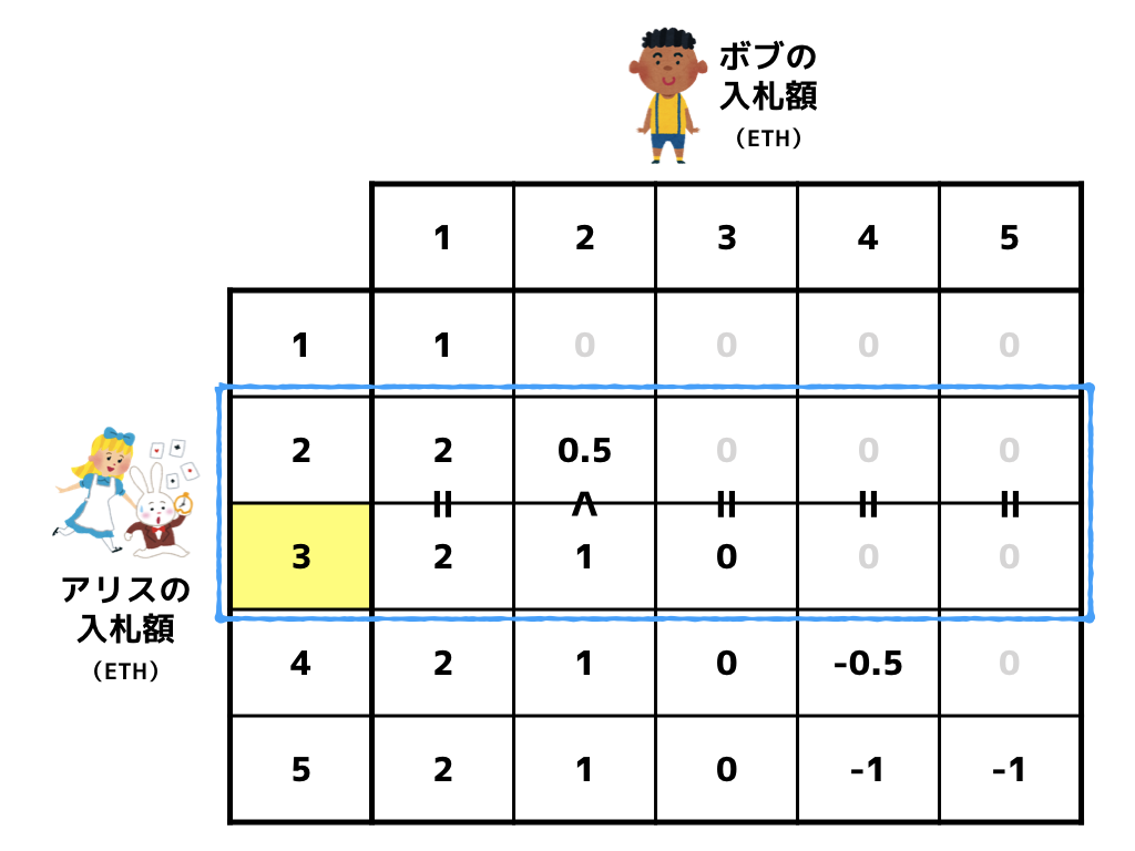 ボブの入札額が 1 ETH or 3 ETH or 4 ETH or 5 ETH の場合、アリスは 2 ETH で入札しようが 3 ETH で入札しようが利得は変わりません。しかし、ボブの入札額が 2 ETH の場合、アリスは 2 ETH で入札するよりも 3 ETH で入札するときの方が利得が大きくなります。よって、アリスは 2 ETH で入札するよりも 3 ETH で入札すべきでしょう。