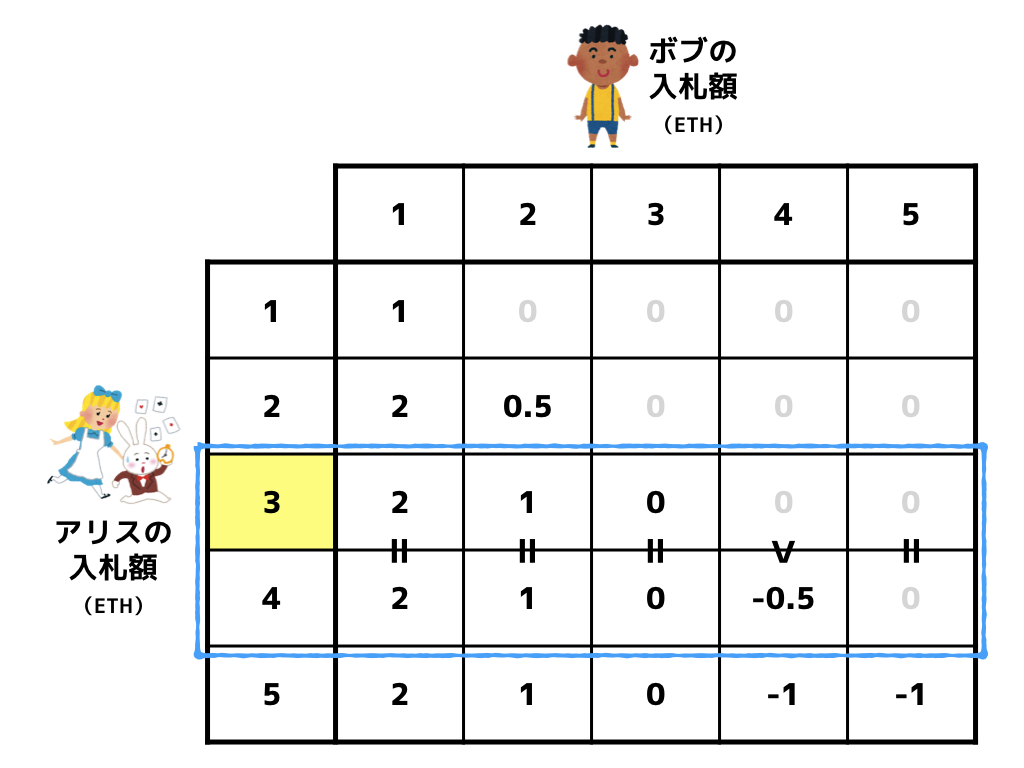 ボブの入札額が 1 ETH or 2 ETH or 3 ETH or 5 ETH の場合、アリスは 3 ETH で入札しようが 4 ETH で入札しようが利得は変わりません。しかし、ボブの入札額が 4 ETH の場合、アリスは 4 ETH で入札するよりも 3 ETH で入札するときの方が利得が大きくなります。よって、アリスは 4 ETH で入札するよりも 3 ETH で入札すべきでしょう。