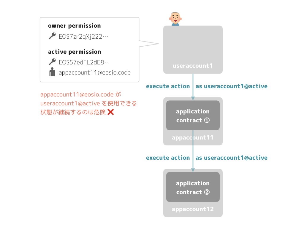 すなわち、この状況下では、appaccount11 の管理者に useraccount1 の permission を濫用されてしまう可能性がある。また、appaccount11 の管理者に悪意がなくとも、デプロイされた contract に脆弱性があった場合の被害拡大に繋がる可能性がある。冒頭で述べたようなニーズを満たすためとはいえ、こういったリスクは極力低減したい。